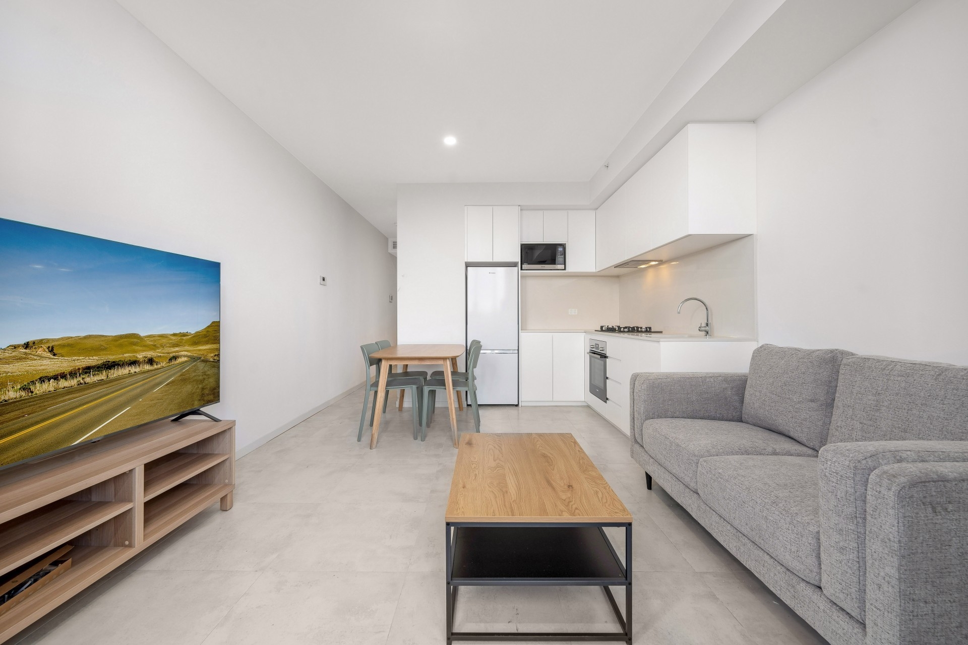 – Fully equipped, stylish galley kitchen with modern appliances featuring a full-sized fridge (340L), oven, cooktop, and microwave.