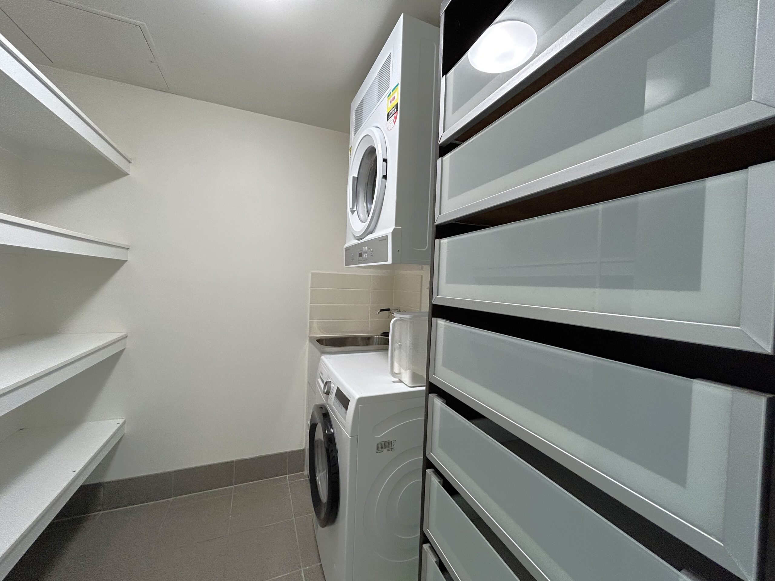 Separate laundry room with ample shelves for storage